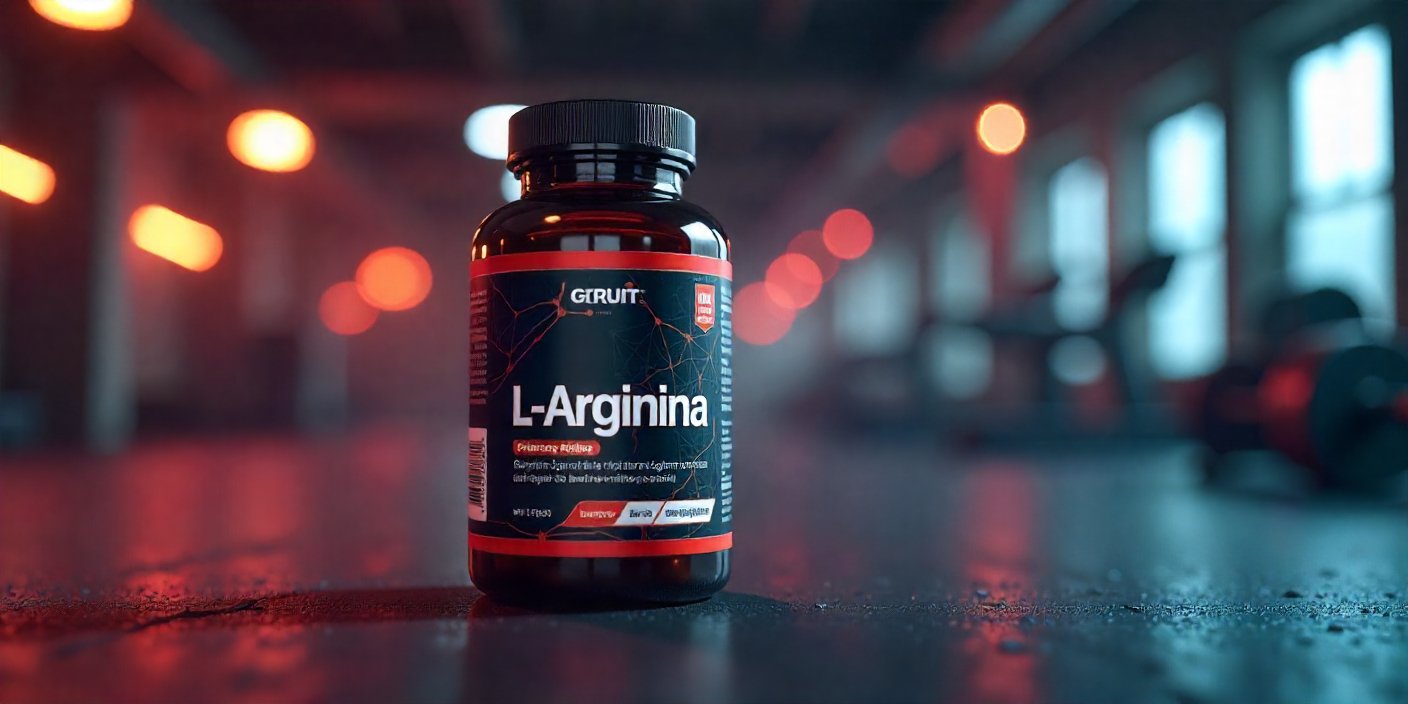 Bote de L-Arginina en fondo deportivo, simbolizando la mejora del rendimiento físico y la vasodilatación muscular